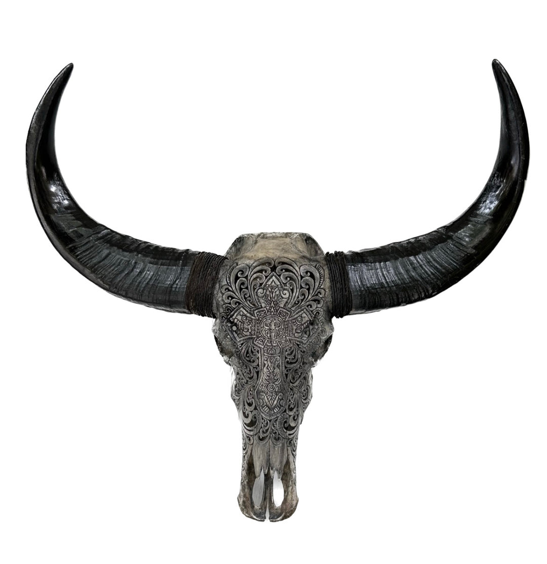 You can get your hands on an amazing piece of art. By owning this carved bull skull that exhibits a striking engraved design, handcrafted in Bali, the “Islands of the Gods.”